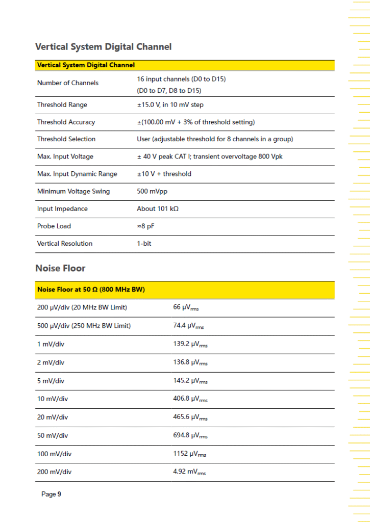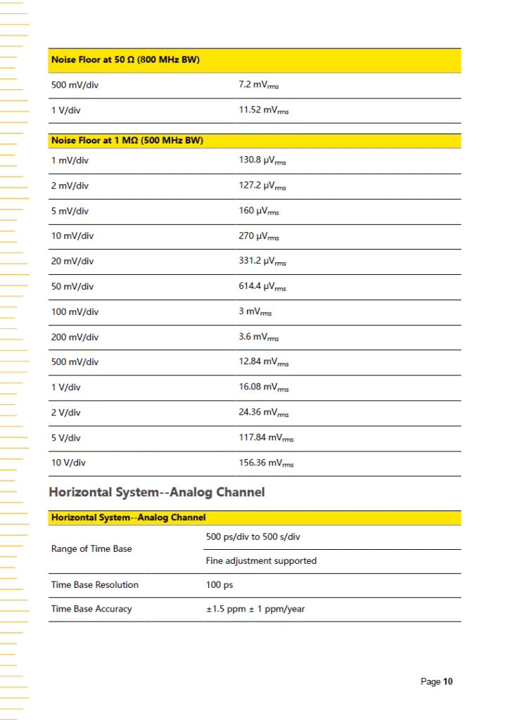 今回のレビューでは実測で評価していますが、RIGOL公式の製品データシートにもノイズフロアの記載がありましたので掲載しておきます。