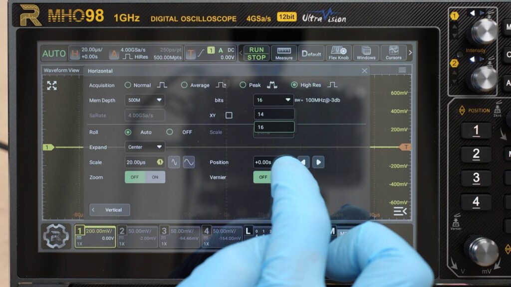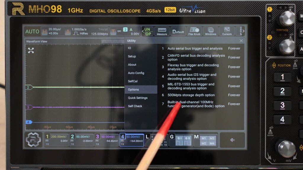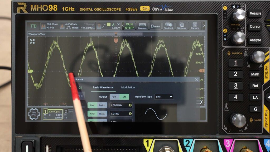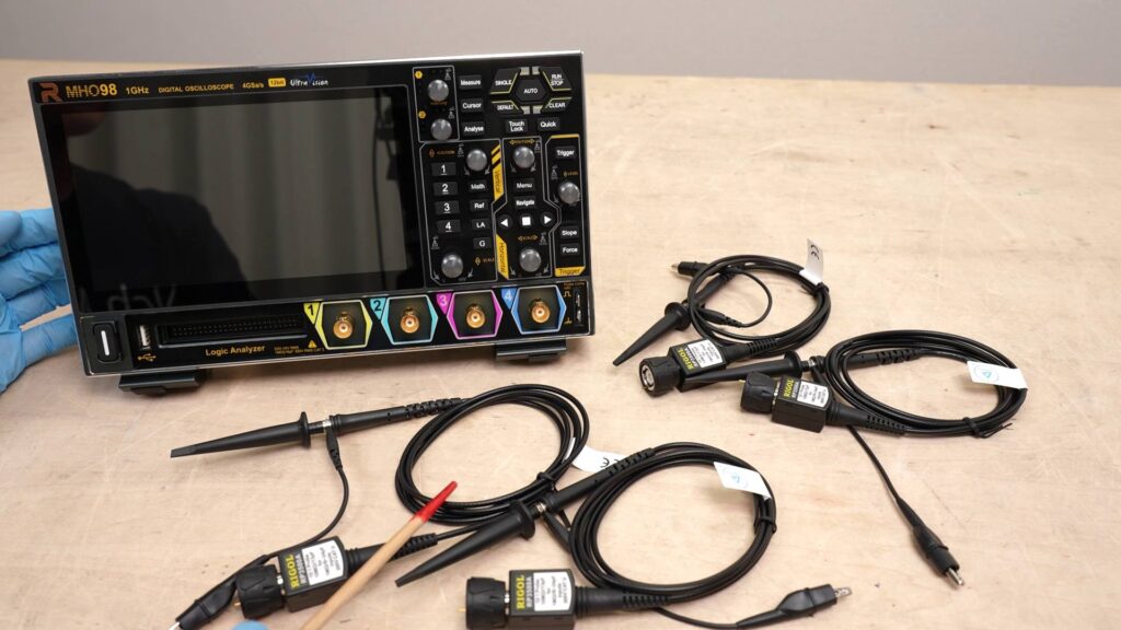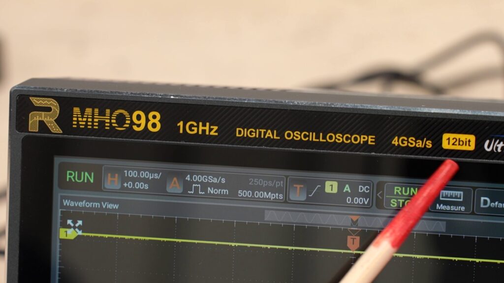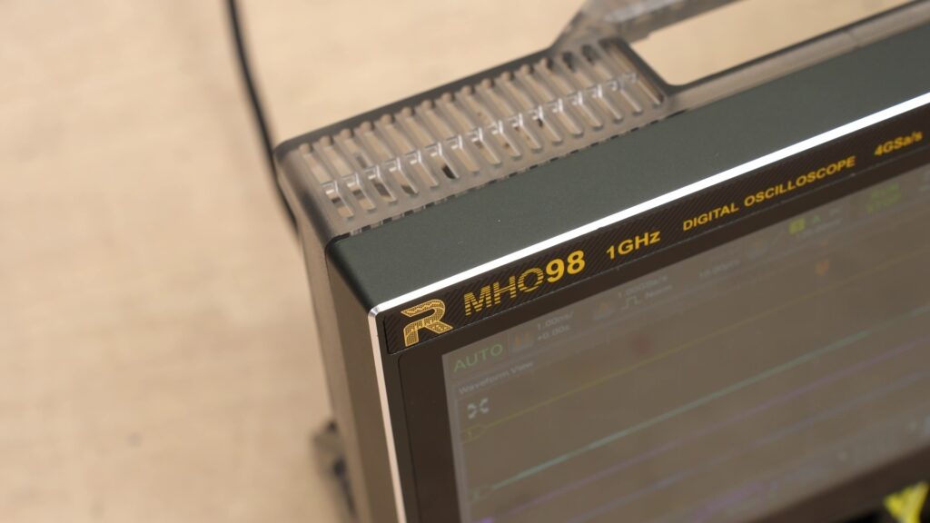 フロント側にはMHO98 1GHz 4GSa/s 12bitの表記が確認できます。以前からRIGOLのオシロスコープはそのサイズ感に見合わないスペックをしていましたが、ついにこのサイズ感のオシロスコープで1GHzという数字を目にするようになってしまいました。