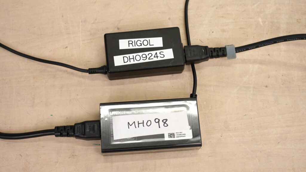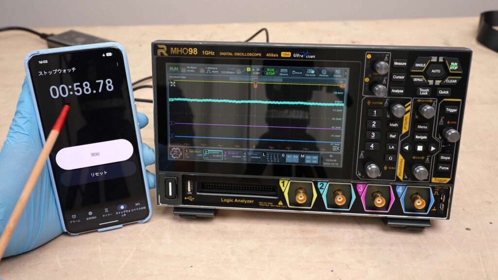 またRIGOLの一部オシロスコープでは電源ユニットを内蔵せずにUSB給電を使用しています。今回の検証でも製品に付属している電源アダプタを使用しているのですが、他のUSB充電器やモバイルバッテリーを使用したり、あとはアース端子の接続によって結果が変わる可能性があります。