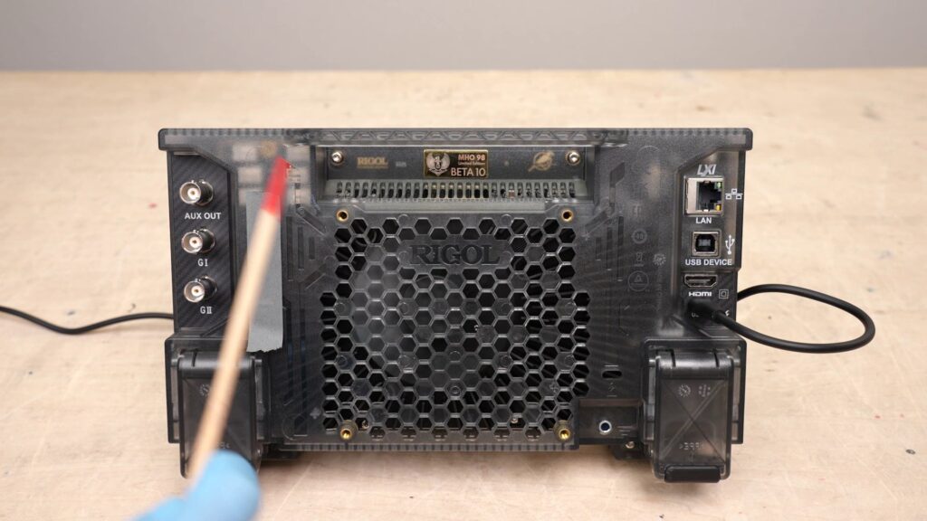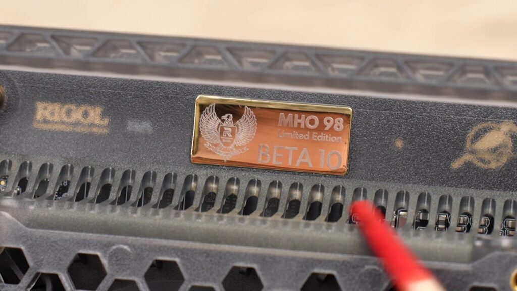 また、この限定モデル最大の特徴とも言えるのが背面に取り付けられた金の銘板です。RIGOLの情報では24金が使用されているらしく、今回手元に来たデモ機には「BETA 10」と刻印されていました。これについては製品版では1から1998までのシリアルナンバーが刻印されるものと思います。