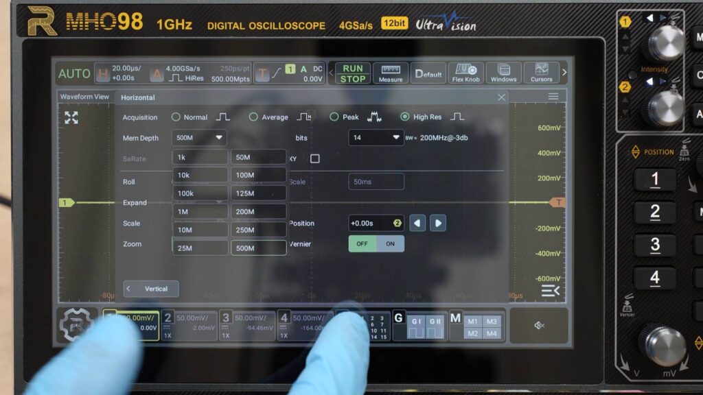 また今回レビューしているMHO98では標準で500Mポイントという大容量のメモリを標準で搭載2しています。長時間の波形取得が可能になることで、組み込み開発の現場でマイコンの電源が落ちる瞬間の各端子の挙動を詳細に捉える、といったような解析が容易になります。