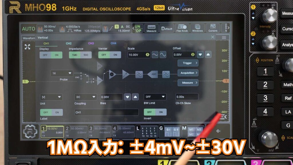 MHO98のアナログ入力端子は入力インピーダンスが1MΩと50Ωの間で変更が可能です。ただしACカップリングについては1MΩ入力時に限られてるほか測定可能なレンジについてもやや異なっており、1MΩ入力時は±4mV~±30V、50Ω入力時は±800μV~±4Vでした。