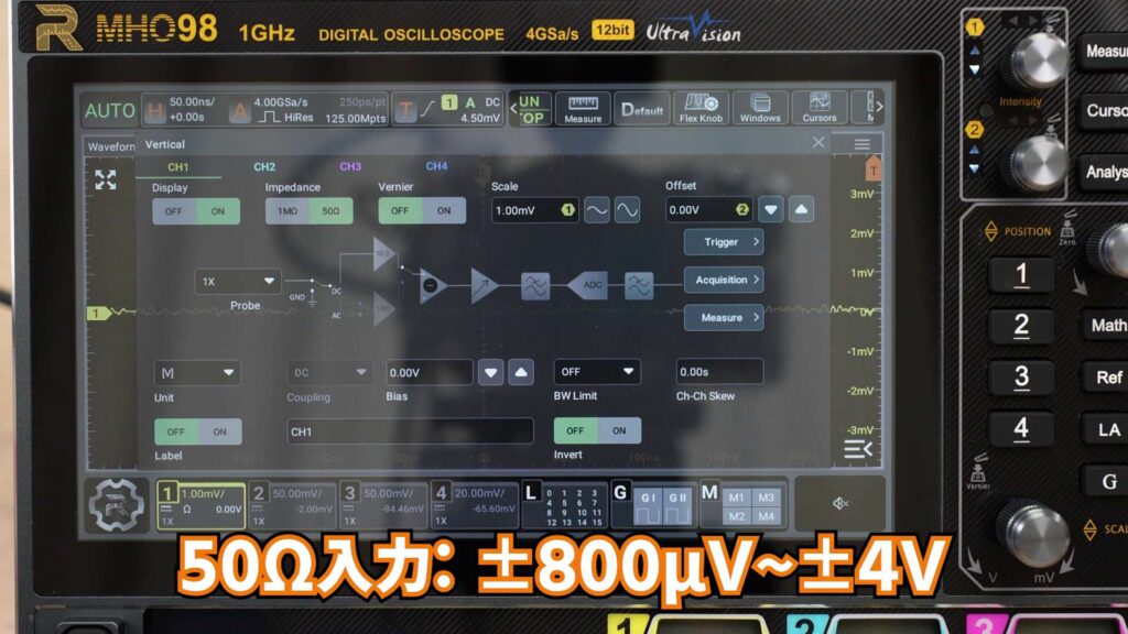 前述のとおり、MHO98では4つ全てのアナログチャンネルで50Ω入力に対応しています。