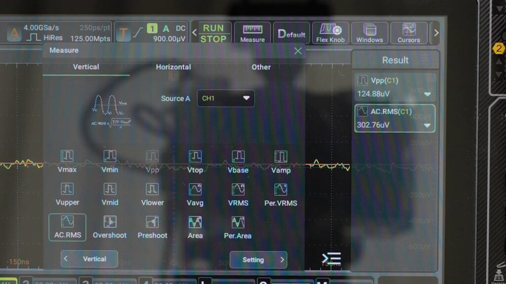 アナログ入力のバックグラウンドノイズについても測定していきます。測定には内蔵されているMeasure機能でCH1のピークtoピーク電圧(VPP)と交流実行値(AC.RMS)を見ています。