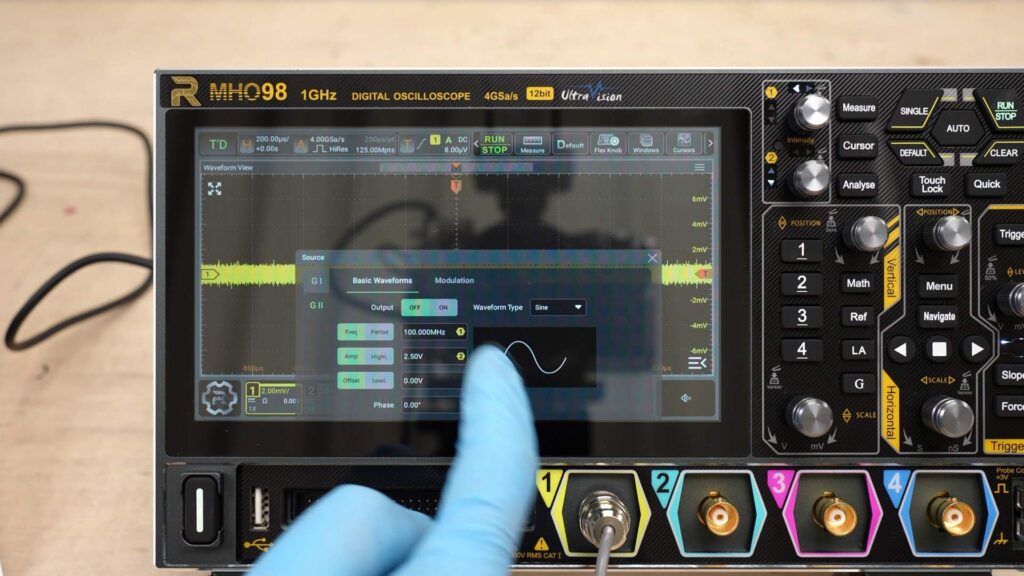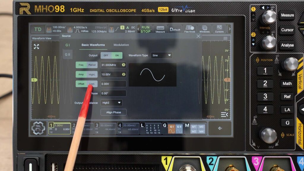ちなみに多くのオシロスコープ内蔵ファンクションジェネレータでは2チャンネル同時使用した際に最大周波数が制限される事が多いのですが、MHO98は2チャンネル同時に出力を有効にした場合であっても100MHzを出力可能です。
