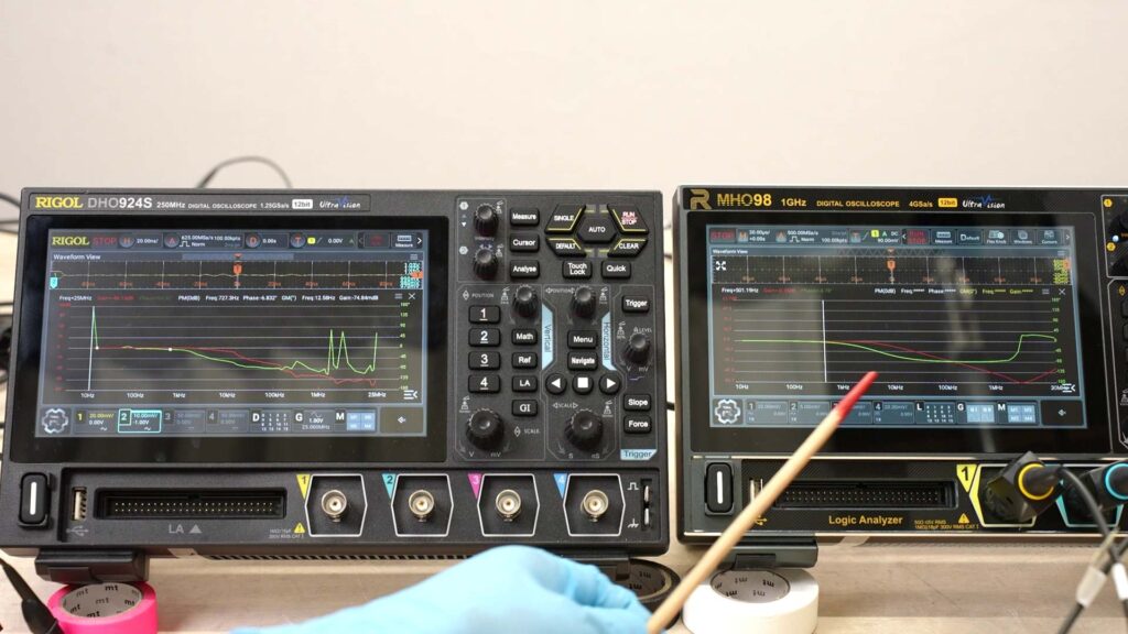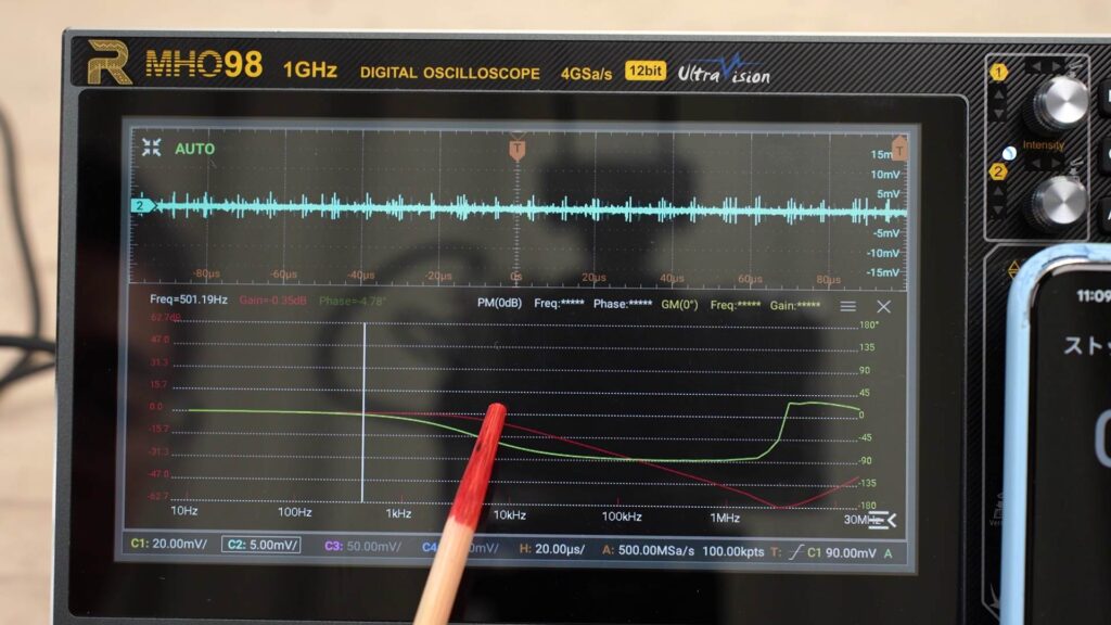 以前からイチケンの事務所にあるDHO924Sでも同様の機能は搭載されているのですがうまく機能していません。今回のMHO98では理想的なボード線図が描画できていますので、本体の仕様かソフトウェアでの改善が見られます(DHOのファームウェアアップデートはどこですか…)。