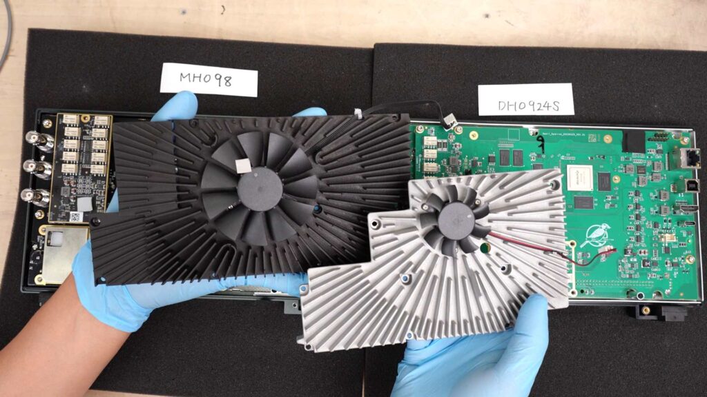 本体背面側のパネルを外すとこのような感じです。MHO98はDHO900Sよりも大型のヒートシンクを搭載していることが分かります。フィン形状の変更や溝も深くなっており、放熱性が高められていることがわかります。