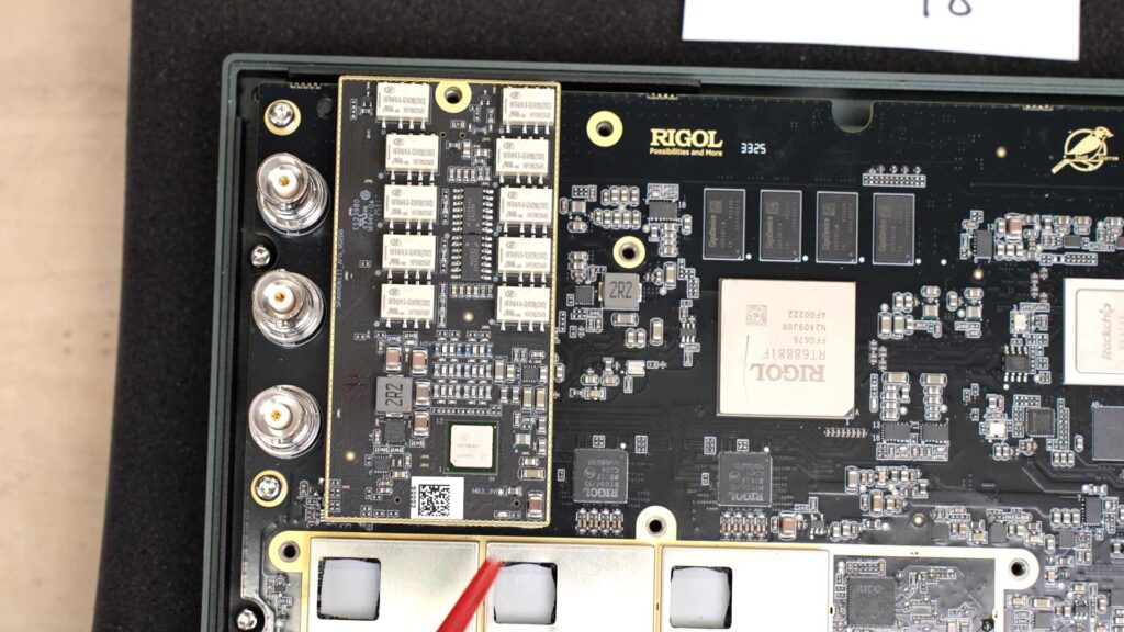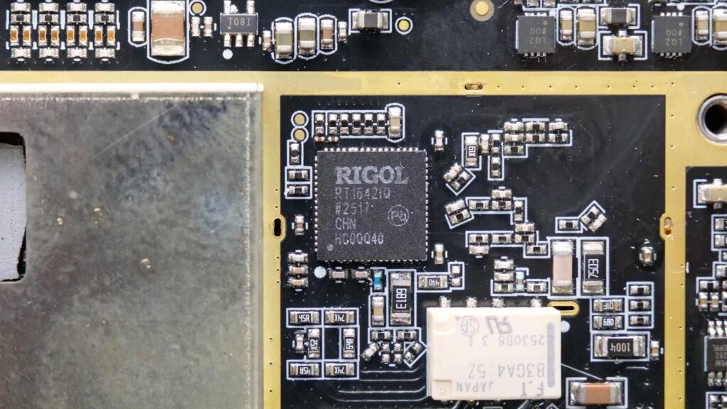 アナログフロントエンド部分はヒートシンクの凹凸に加えて、基板にはんだ付けされたアルミシールドで厳重に覆われています。一箇所だけシールドが取り外されているようになっていましたので内部のICを確認してみたところ、アンプICにはDHO900シリーズと同じ、RIGOL自社設計の「RT1642IQ」が採用されていました。
