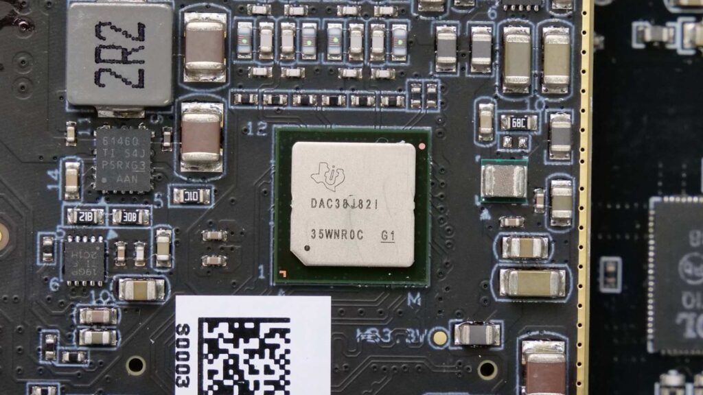 なおファンクションジェネレータについてはDHO900から変わらず別の基板に実装されている形となっており、DAコンバーターにはテキサス・インスツルメンツ社の「DAC38J821」が採用されていました。チャンネル数が増えたことで全体的に部品点数が増えていることが分かります。