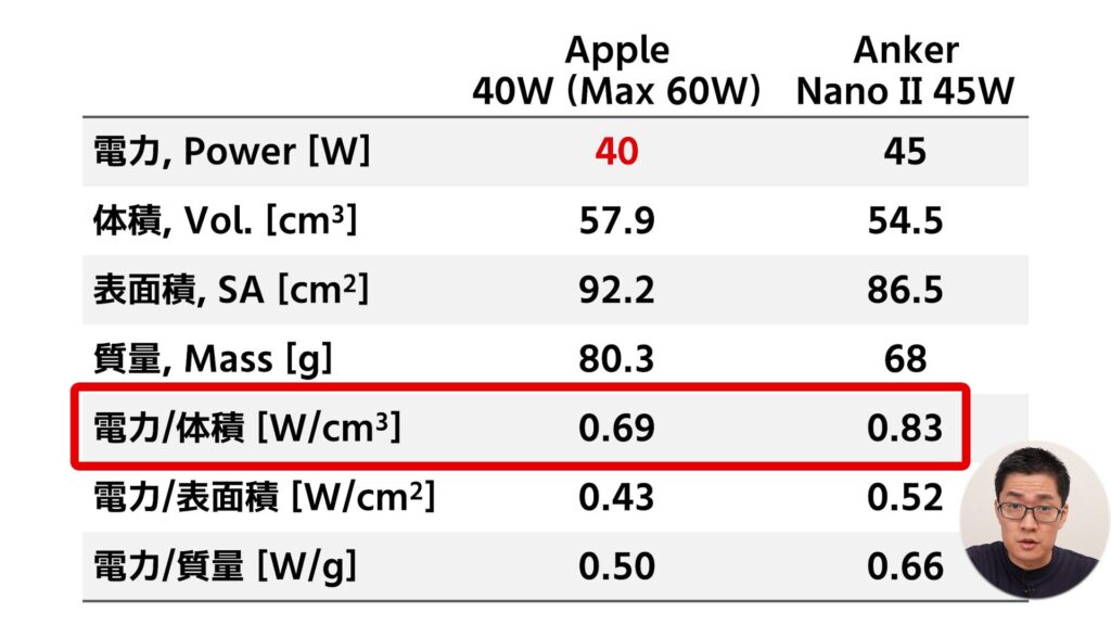体積や質量を見る限り、Anker Nano II 45Wとの比較ではあまり差はない印象です。Apple 40Wダイナミック電源アダプタ(最大60W対応)の体積あたりの電力は0.69W/cm³と、45Wクラスで比べた場合にはそこまで高い数値ではありません。