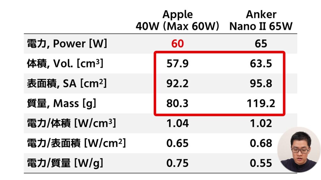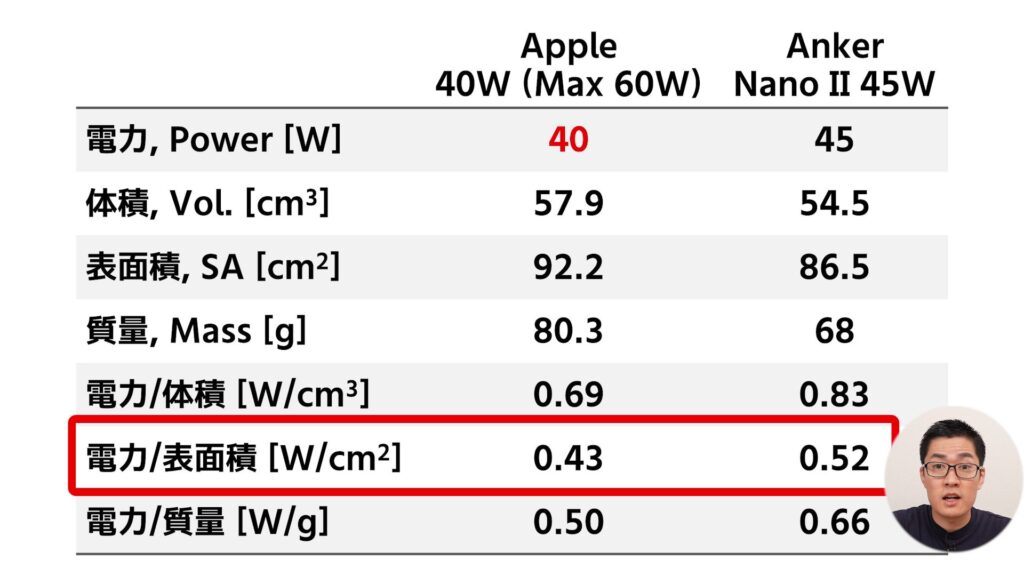 一方で表面積あたりの電力は0.43W/cm²と小さく、Anker Nano II 45Wよりは放熱に有利な設計と言えます(あくまで40W出力時の話)。