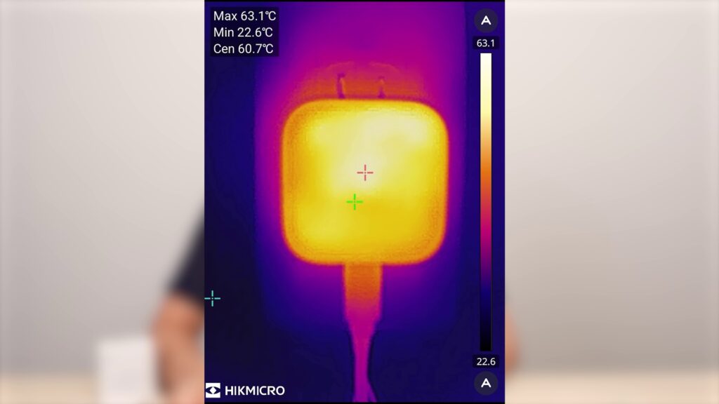75℃~80℃といった高温になる製品も多い中、このクラスのUSB充電器としては比較的控えめな温度に留めていると言えるでしょう。ちなみに後で分解して確認したところ、最も熱くなっているのは変圧器が配置されている箇所でした。
