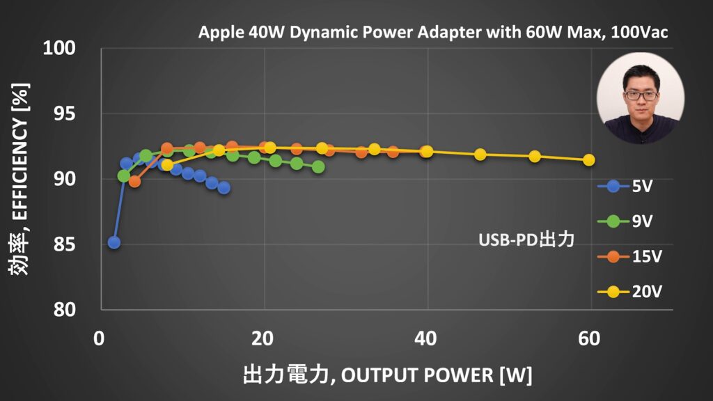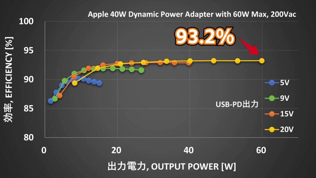 結果として、非常に幅広い範囲で92%を超える高い効率を示しました。特に、普段よく使うであろう40W以下の領域で効率が高くなるように最適化されているように見え、最高効率は15V出力時の92.5%です。