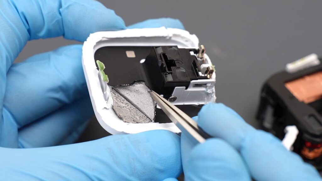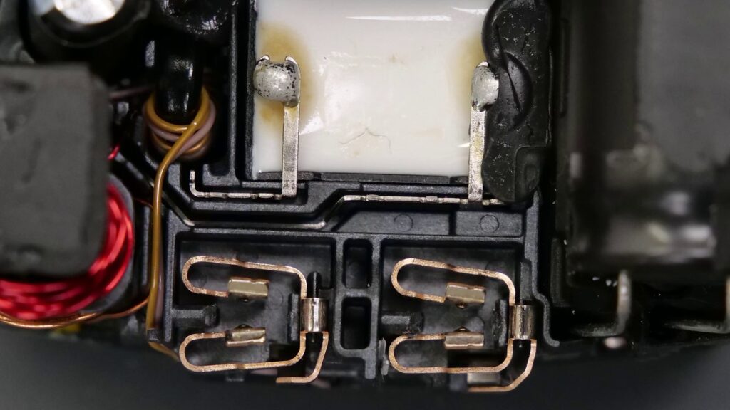 最近の多くの充電器では、筐体内部にTIM(サーマルインターフェースマテリアル)として熱伝導シリコンを充填して、基板面で発生した熱を筐体全体で放熱する方式を採用しているのに対し、この充電器ではTIMの充填は見られません。