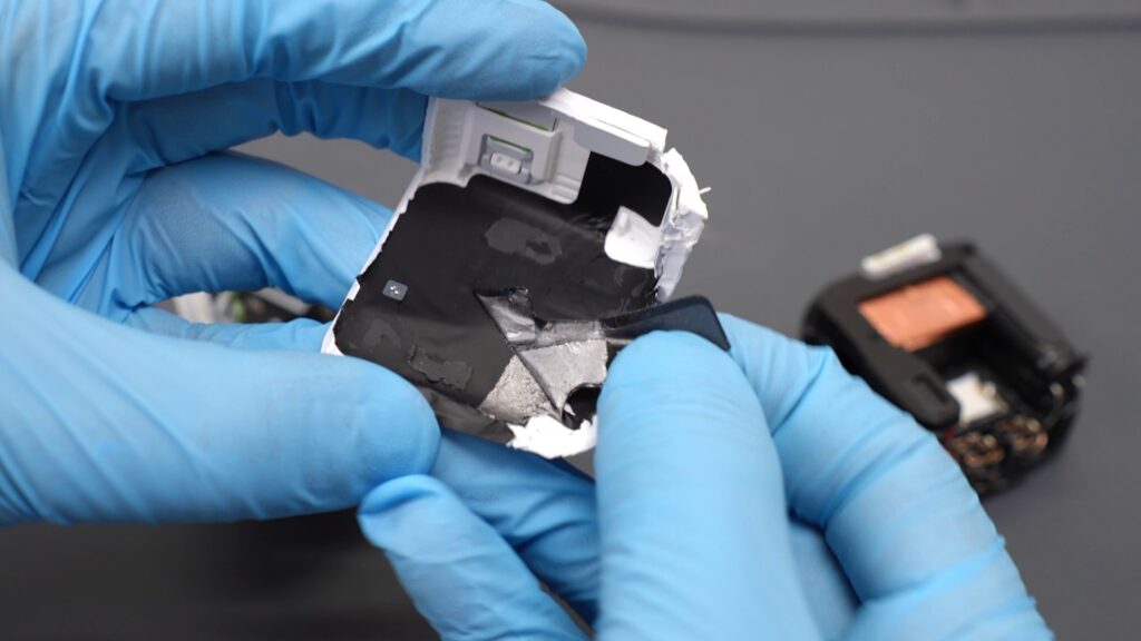 その代わり、外装の内側にはグラファイトシートがいたるところに貼り付けられていました。これで熱伝導と本体外装を通じての放熱を行っているようです。