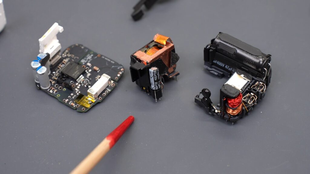 まず外装を剥がすと、すぐに内部の構造を確認することができました。これまで分解してきた同クラス帯のUSB充電器とは放熱の方式がかなり違っているようなことがわかります。