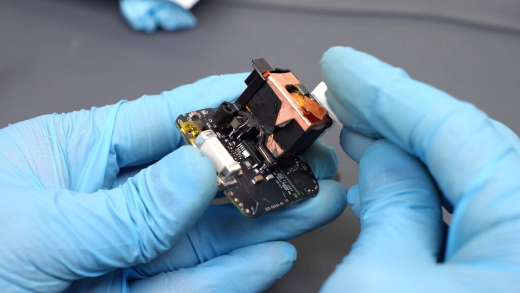 次に取り出した中身についてよく見ていきます。内部の部品や配線は樹脂部品によって立体的に、かつ精密に固定されています。結構コストがかかってそうな構造です。